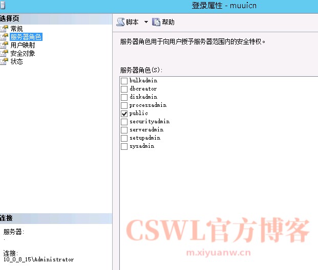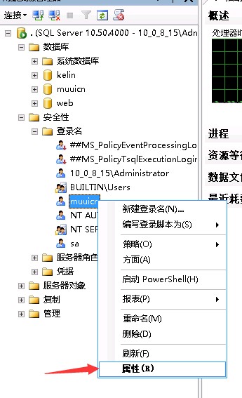 打开数据库管理 选择安全性>登录名 选择你站点的登陆账号右键进入属性