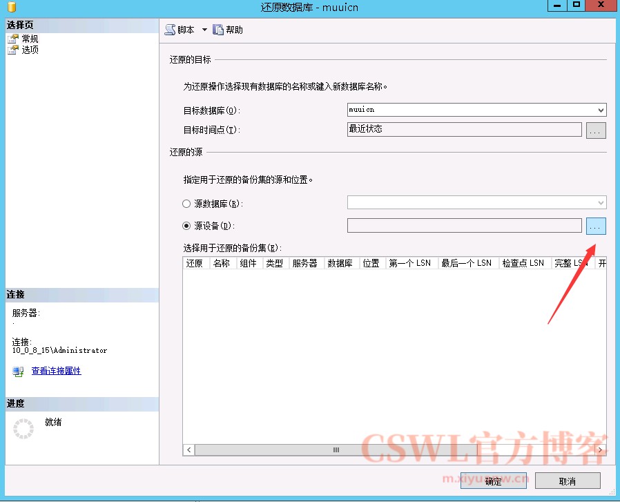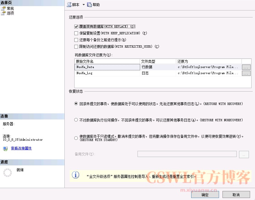 6.4 点击选项,在还原选项下面“覆盖现有数据库”打个对号,然后点击下方确定