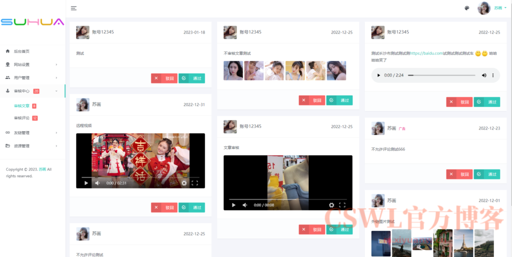 支持发布音乐 支持日夜模式、搜索功能、回到顶部 支持游客点赞及评论 可开启用户发布文章及评论审核(防止用户发布恶意内容)可管理全站用户支寺图片上传自动压缩大小 更多功能可自行探索!