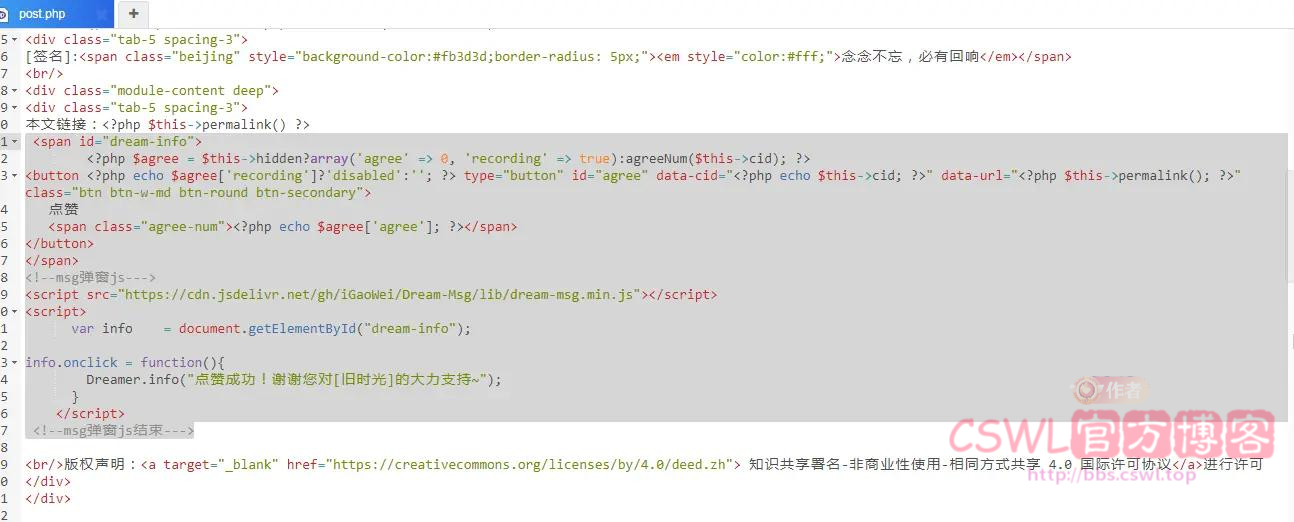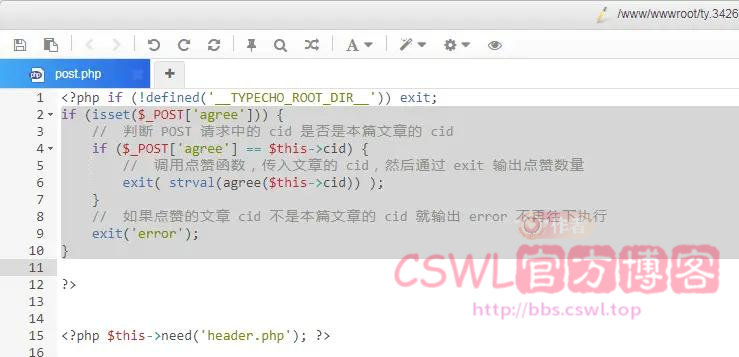 然后找到post.php在顶部加入以下代码用于判断是否是点赞的 POST 请求: