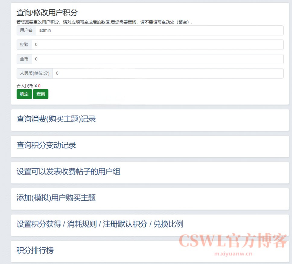 积分插件完整版。积分规则、升级用户组、付费主题、兑换、转账、消费记录、积分查询面板。